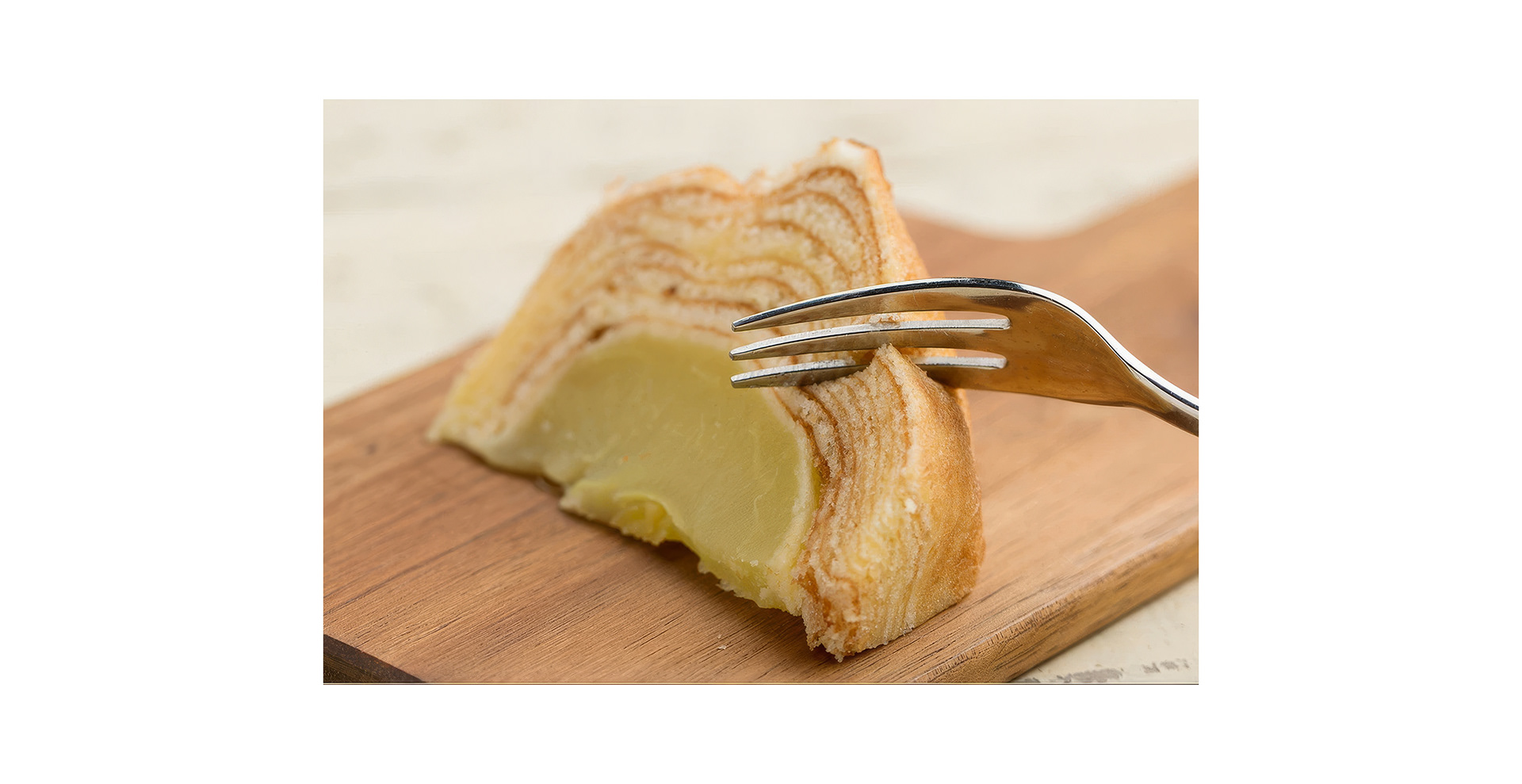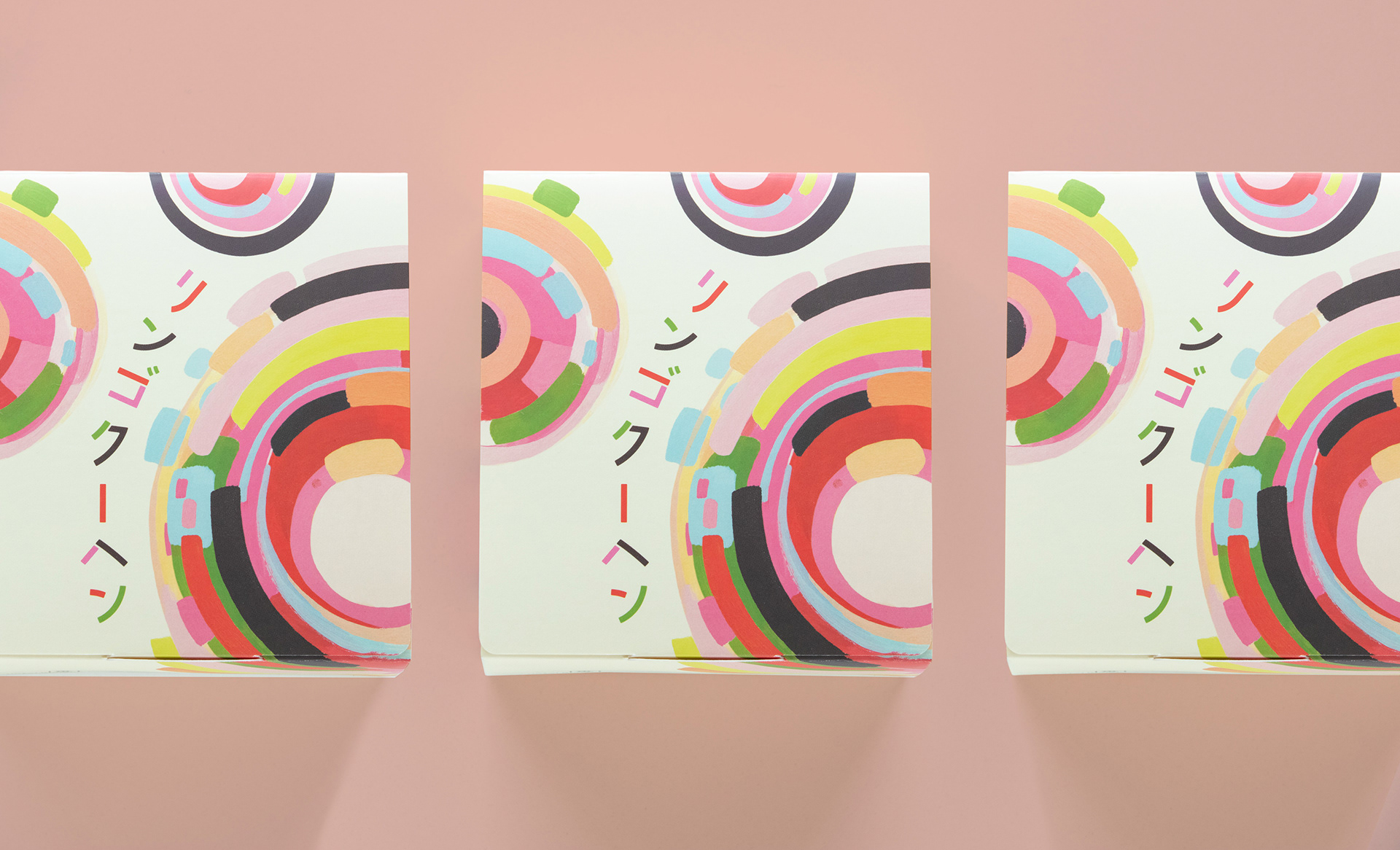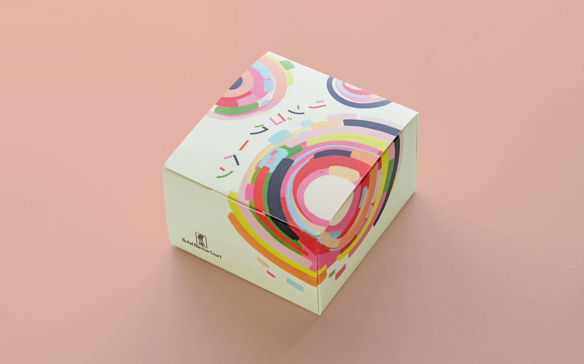 A colorful hand-painted package design for Hotel Bleston Court's apple baumkuchen cake, which is a baked apple enclosed in many layers of cake resembling tree rings.