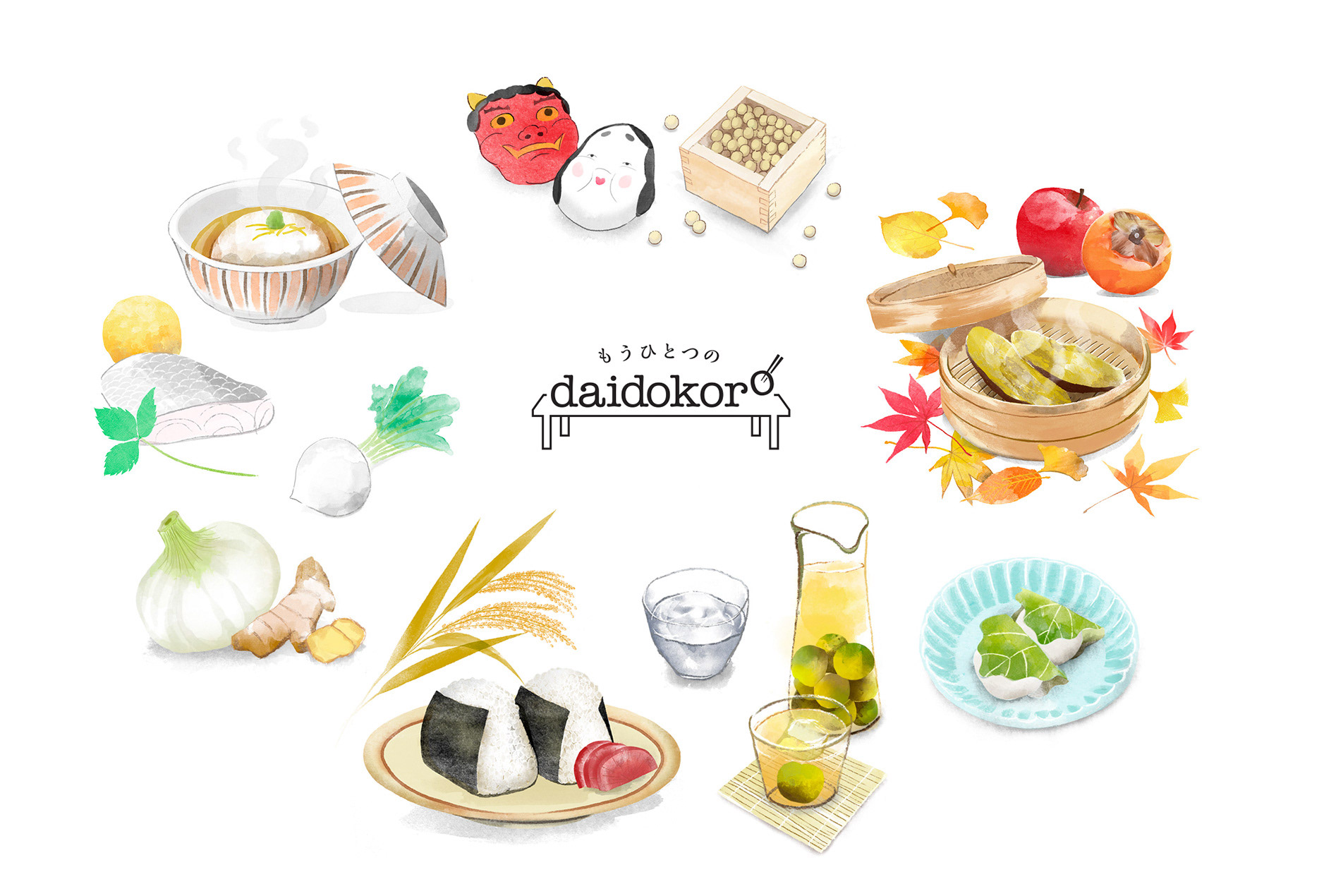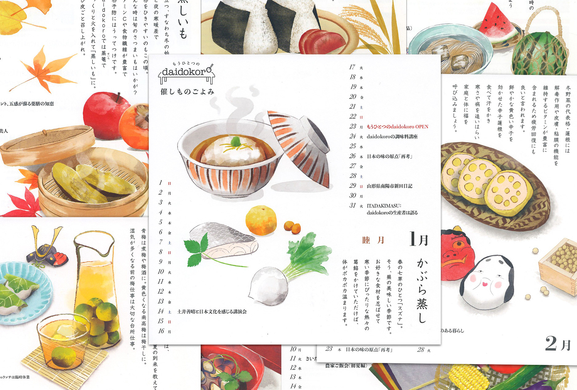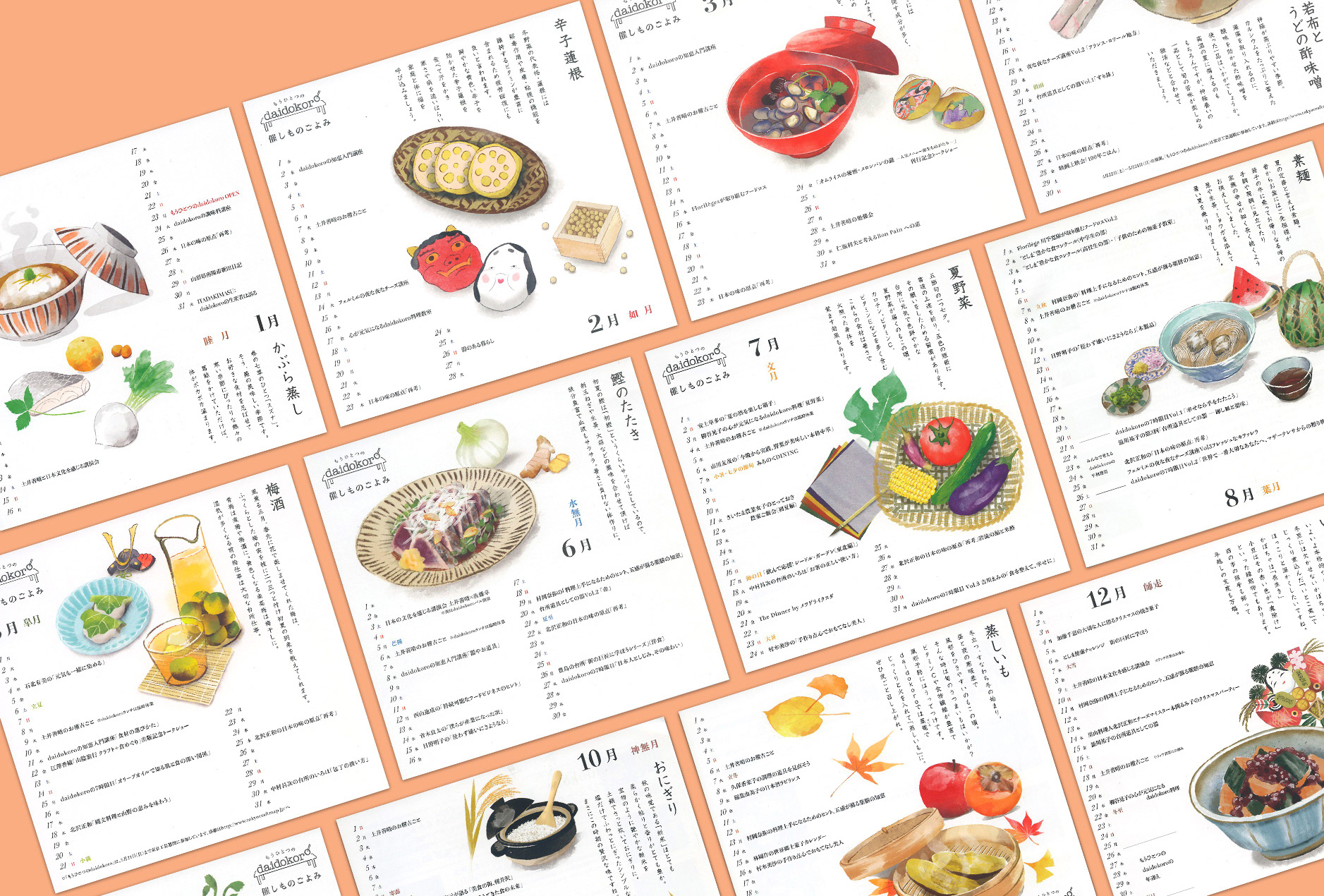 Monthly illustrations of the seasonal recipes being taught at the Daidokoro restaurant and event space in Tokyo.